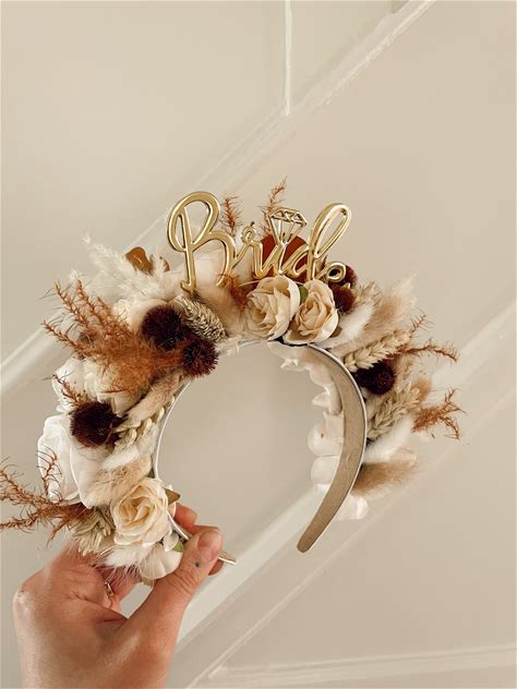 Bridal Bride To Be Hen Do Party Gold Rustic Brown Cream Ivory Orange Pampas Dried Flowers Bunny Tails Wreath Headband Headpiece Crown