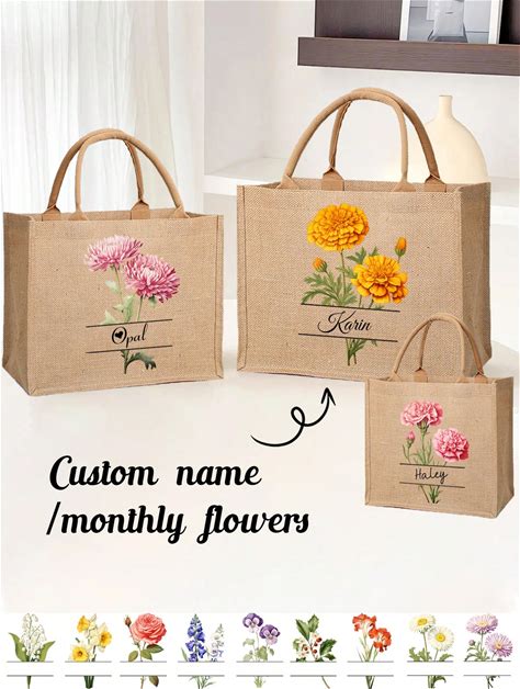 1/2Pcs Personalized Custom Name Month Flower Beach Burlap Tote Bag, Bride Honeymoon Bridal Shower Boho Rustic Wedding Engagement Bachelorette Hen Party Bridesmaids Proposal Gift Letter Portable,Medium